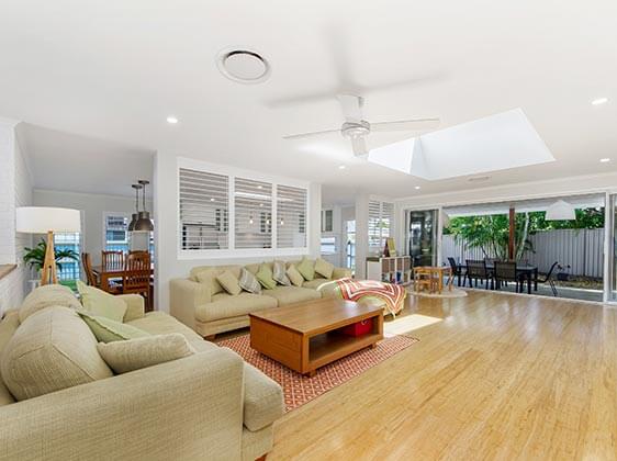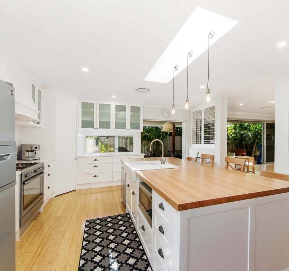 Renovation and extension of a family home in Burleigh. This Hamptons style house had many outstanding features including a raised entry supported by hardwood timber posts, tumbled brick panels as a wall feature and bamboo flooring throughout.